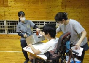 B高で生徒会選挙が行われました。会長に3名、副会長に3名の立候補者があり、選挙運動期間には選挙ポスターを掲示したり、各学年で挨拶を行ったりする選挙活動を行いました。9月26日の投票日には、選挙管理委員の生徒の立ち会いの下、立候補者演説会が行われました。立候補者それぞれの、「学校をより良くしたい」という気持ちの込もった演説に、心が動かされました。その後、早島町役場からお借りした投票箱等を使用して選挙を行いました。選挙管理委員から投票用紙を一人一人受け取り、真剣に選んで投票しました。