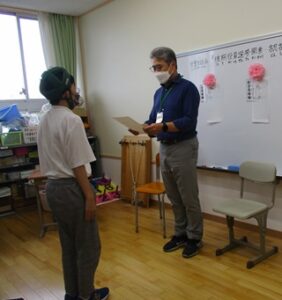 10月2日(金)に令和7年度A部後期児童生徒会認証式が行われました。後期役員の認証が行われ、校長先生から一人ひとりに認証書が手渡されました。新役員からのあいさつでは、「よりよい学校にみんなで一緒にしていきましょう。」と、頼もしい決意が述べられました。これからの後期の学校生活を、児童生徒会執行部のみなさんを中心に、さらに楽しく、安心して過ごせるものにしていきましょう。みんなで協力して盛り上げていきたいと思います。