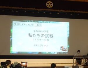 学習発表では、「早島ゆめ水族園 私たちの挑戦」 をテーマに発表を行いました。7月にプレオープンした「早島ゆめ水族園」に向けて取り組んできた学習の様子や、プレオープンを体験した児童生徒・教員からの感想を受け、1月に予定されているオープンに向けての意気込みを発表しました。