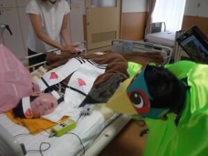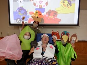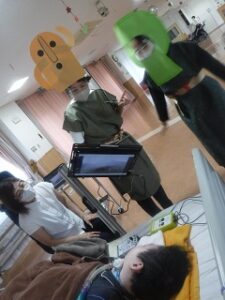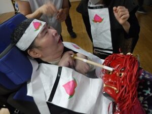 がったんごっとん山登りの後は元気に「古墳にコーフン健康体操」を踊ります。みんなこの愉快な曲が大好き☆ もちろん桃太郎に変身して鬼退治も行きますが…思ったより鬼が怖かったのか、鬼退治を拒否する人もいます。いや、困ったな。あなたが行ってくれないと話が進まないのです…。という珍道中も起きましたが、なんとか授業で習った剣道の技で鬼を倒して、お土産をゲットしました。始終ニコニコ笑顔で嬉しさ大爆発の生徒たちに、見ているこちらも癒された一日でした。よく頑張ったね。