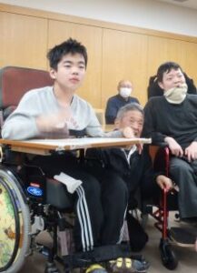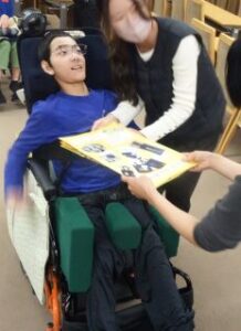 11月14日(金)、秋晴れのさわやかな気候に恵まれ、福祉タクシーに乗って、全員そろって「ゆるびの舎」へ出かけました。到着後は、図書館司書の方に絵本の読み聞かせをしていただきました。普段とは違う場所で、さまざまな種類の絵本に触れることができ、貴重で新鮮な時間となりました。また、12月1日(月)~12日(金)に、早島町社会福祉協議会で行われる「早島支援のおみせ」に向けて、宣伝ポスターを掲示していただけるよう、お願いしました。文化祭で販売した製品を、地域の皆様にも見ていただいたり、購入していただいたりする良い機会となります。今回の取組を通して、地域とのつながりを感じながら、学びの広がりを実感できる一日となりました。