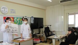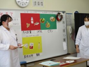 12月9日(火)の給食時間に、A高生徒を対象に、実習生による栄養指導を行いました。食品が体の中で果たす3つの役割について学び、当日の給食に使われている食材を赤・黄・緑の3色に分類しました。ちなみに、当日の給食メニューは、「ごはん 牛乳 鯖の味噌煮 ツナ豆サラダ 根菜汁」でした。給食は毎日、赤・黄・緑の食品を使用して作っています。バランス良く何でも食べて、元気な体を作りましょう!