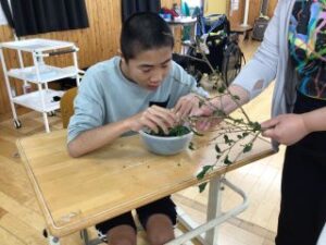 B高ⅢCグループでは、2学期から社会生活の授業でお茶作りを行いました。枝から葉を摘み取るところから始め、葉を煮出したり、乾燥させたりして、お茶を完成させることができました。最後にはみんなでお茶を淹れて、色や香りを楽しみました。